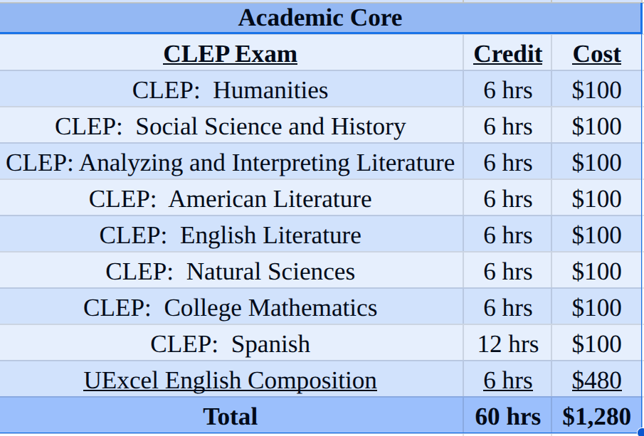 In order to fulfill Excelsior's academic core requirements, I would have to pass nine exams. First, I would take the eight CLEP exams below to complete the majority of my academic core. Second, I would take the English Composition exam from Excelsior College. While the UExcel exam is more expensive at $480, the exam would fulfill the written English requirement. Here's how I'd earn my first two years of college: