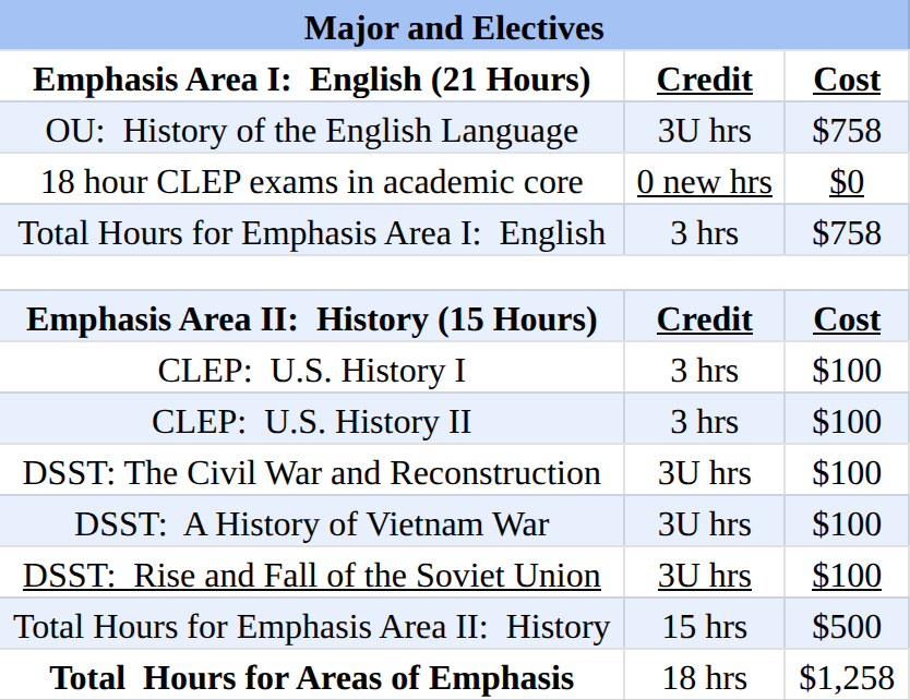 For my History emphasis area, I would take two CLEP exams for 6 credit hours and three DSST exams for 9 hours of upper-level credit. That's the plan for completing my "major;" it seems kinda easy, doesn't it? (Easy for me to say now that I'm no longer a partying 18-year old.)