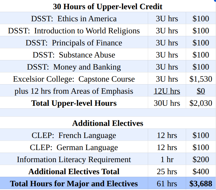 The final step of my degree hack would be to fulfill the requirements for upper-level credits and additional electives. I would take five DSST exams for the upper-level credits, and I would take two CLEP tests and one correspondence course from L.S.U. for the remaining electives. The correspondence course would fulfill Excelsior College's information literacy requirement, but it is currently on hold. (If you know of any cost-effective course that could be used in lieu of the one at L.S.U., please send me a link.)