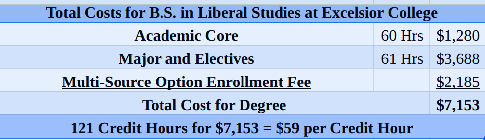 The cost of completing the academic core, the major, and the electives comes to $4, 968. Not too bad for an accredited undergraduate degree, right? However, there is one more fee to add to the cost of the degree: the Excelsior College enrollment fee of $2,185. In my case, I would choose the "multi-source option" because it would allow me to transfer in the bulk of my degree credit. When you add all the costs up, here is the final tally: