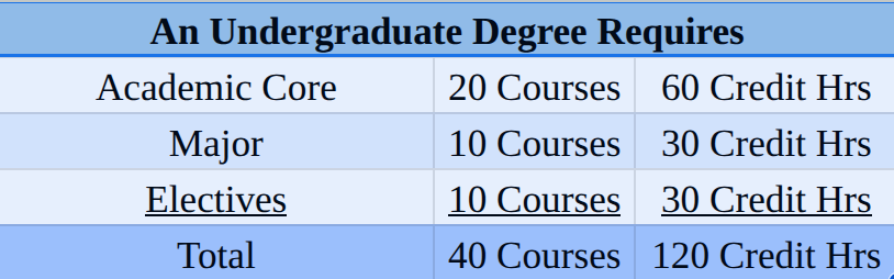 Typically, a degree's coursework consists of three components: the academic core (60 hours), the major or area of concentration (30 hours), and electives (30 hours). Finally, most degrees require at least a quarter of the coursework to be upper-level course credit (30 hours of the 120 total hours). Here's a chart for my visual learners: