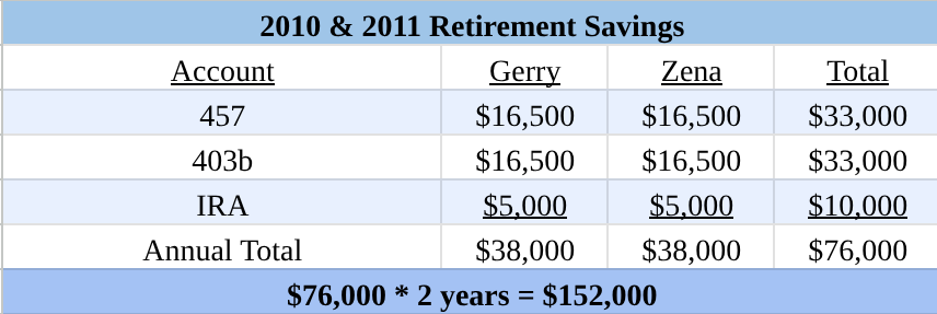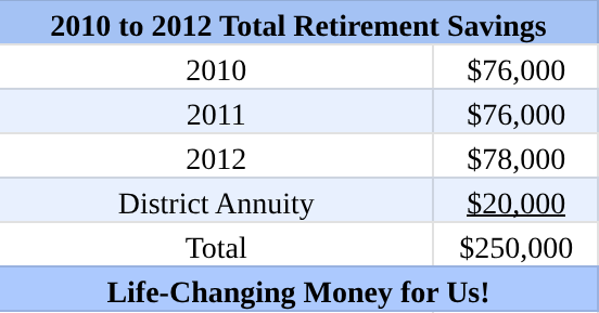 After three years of aggressive savings, we were able to put away $230,000 in our 457, 403b and IRA accounts. During that time our district annuity plan had grown to over $20,000; what an added bonus to our overall savings!