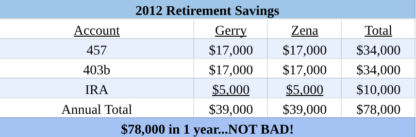 In 2012, 457 and 403b contribution limits increased by $500 per account, so we were able to save even more. Here's the breakdown:
