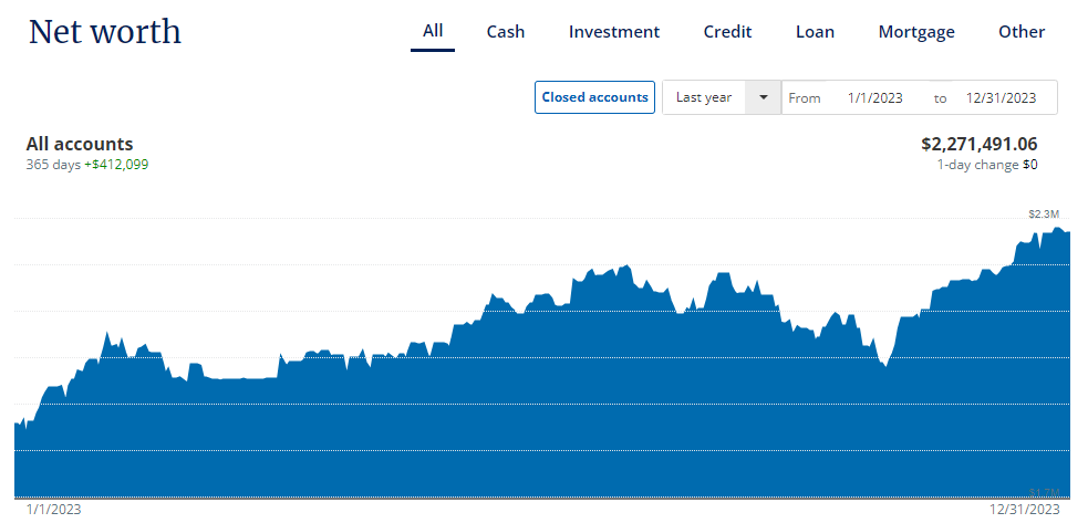 2023 * $9,700 * $2,271,000 – No "real" work in 2023 other than a little substitute teaching, blogging and our credit-tradeline side hustle. We did manage to fully fund our HSA accounts for the year. Since our wealth is now over the $2 million mark, this concludes our net worth updates. Thanks for following our journey!