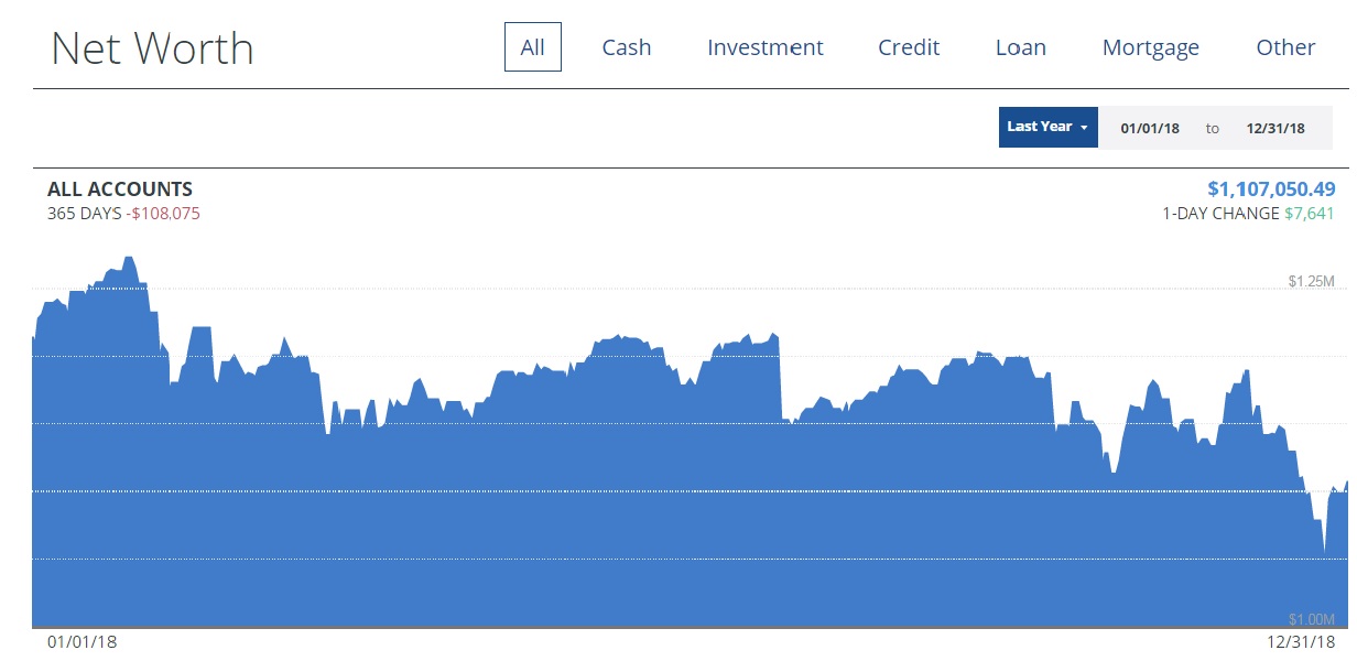 2018 * $58,499 * $1,107,050 – Funneled $43,500 to our 457 accounts and $1,000 to our 403b accounts; employer also made $2,855 of 403b contributions. Also will partially fund our IRA ($8,511) and HSA ($2,633) accounts. Net worth was down from 2017 due to a moody Mr. Market.