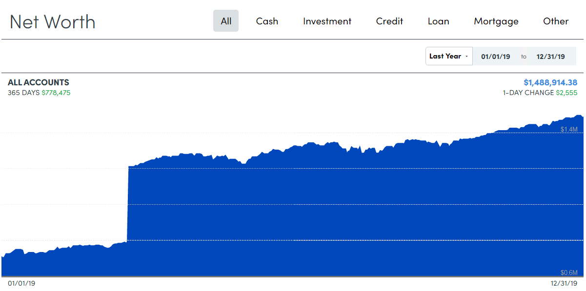 2019 * $130,059 * $1,488,914 – We fully funded every account available to us: 457 ($25k *2), 403b ($25k * 2), IRA ($7k * 2), and HSA ($8k). Plus, we also had employer 403b contributions of about $7,059. Finally, we added $1k to our VTSAX mutual fund. Our biggest year yet!