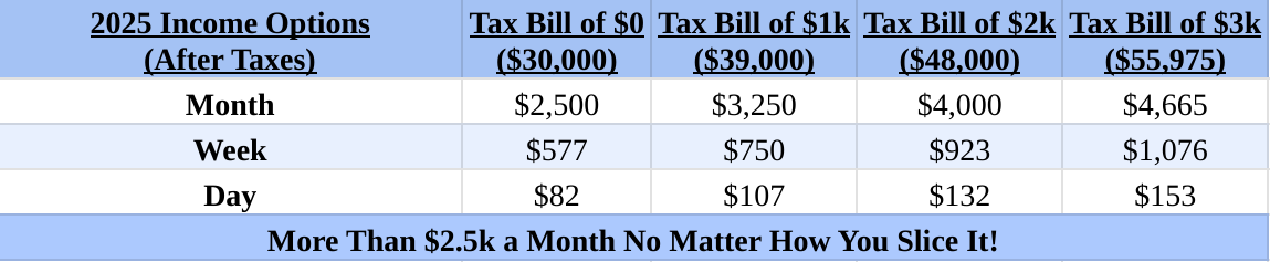 Here are our 2025 income options based on federal income taxes of $1k, $2k, and $3k: