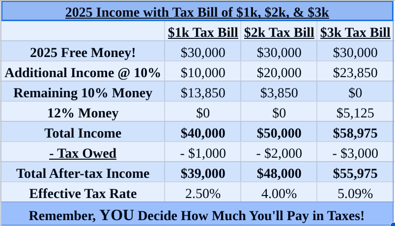 Annual "Eternal Confusion" Note: Because the 10% tax bracket for MFJ is $23,850 for 2025, the calculations are pretty easy. For the $1k example, a tax bill of $1,000 results in $10,000 of additional income ($1,000/.10). For the $2k example, a tax bill of $2,000 results in $20,000 of additional income ($2,000/.10). Finally, the tax bill of $3k yields an additional $28,975 of income ($385/.10) + ($615/.12). (If this sexy tax math confuses you, don’t feel bad because taxes are confusing to most people.)