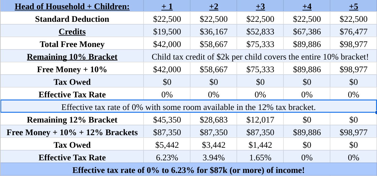 If you have children who qualify for the child tax credit and your filing status is “Head of Household,” here’s your table:
