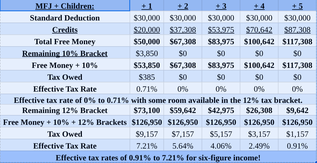 If you have children who qualify for the child tax credit and your filing status is “MFJ,” here’s your table: